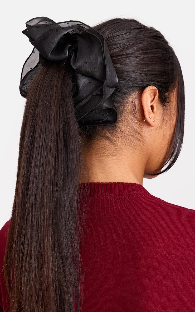 Якщо ваш одяг на день потребує додаткової дрібниці, не дивіться далі, ніж ця велика гумка з органзи в горошок. Виготовлений із чорної органзи з малюнком у горошок і завищеним кроєм, що не сподобається? Стилізуйте цю чорну гумку для волосся будь-яким чином, щоб створити вишуканий завершальний штрих. Категорія: АксесуариТип продукту: Гумка для волоссяКолір: ЧорнийВипадок: День