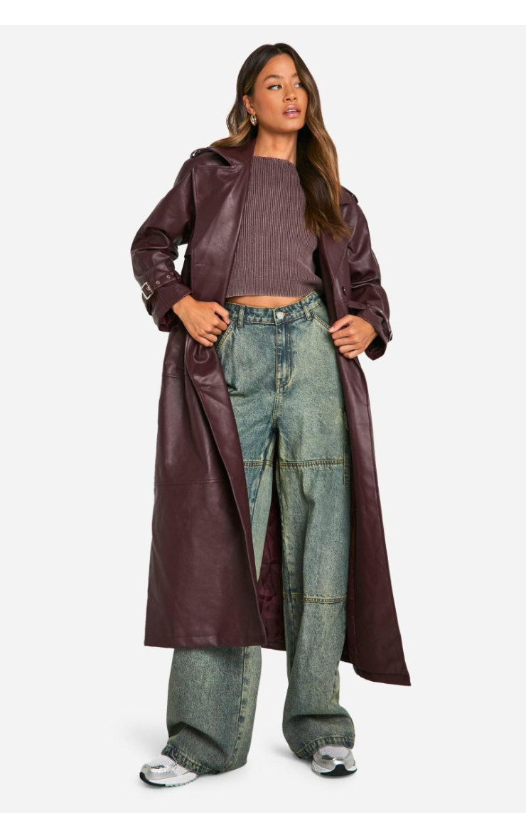Високий подвійний тренч зі штучної шкіри