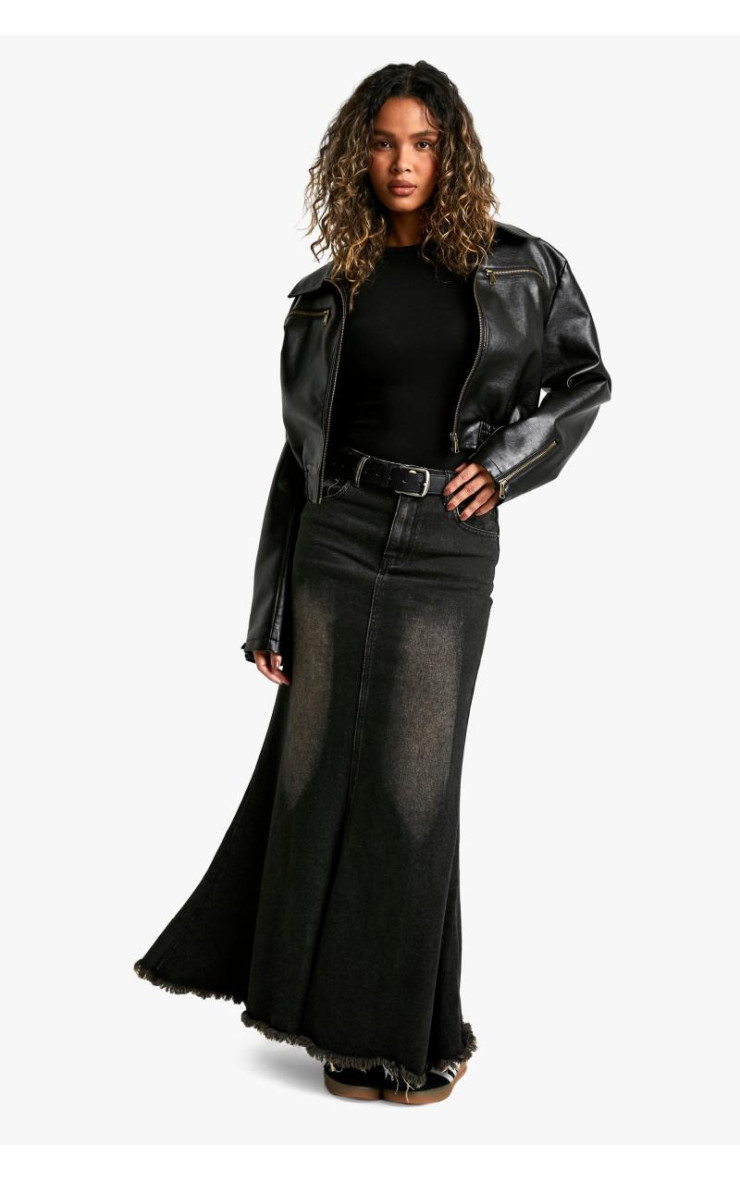 Джинсова максі-спідниця з необробленим подолом «риб’ячий хвіст».