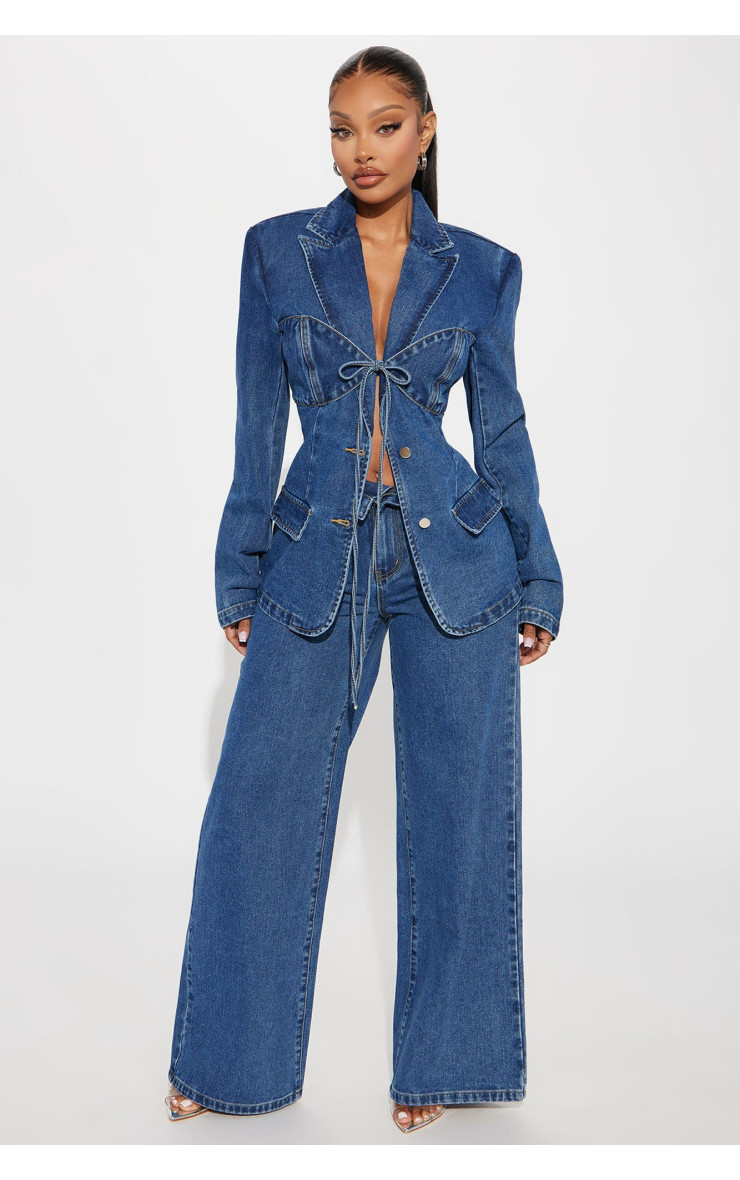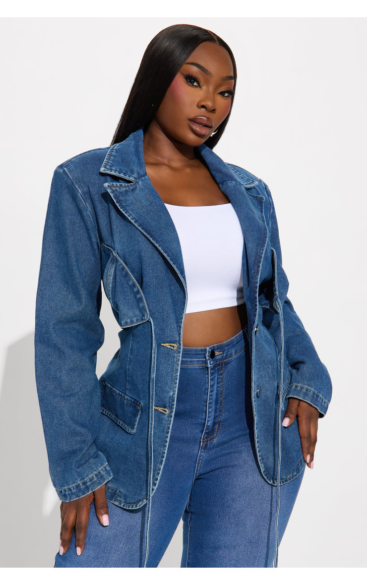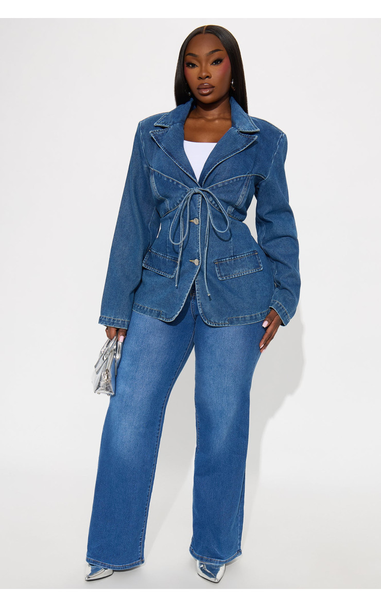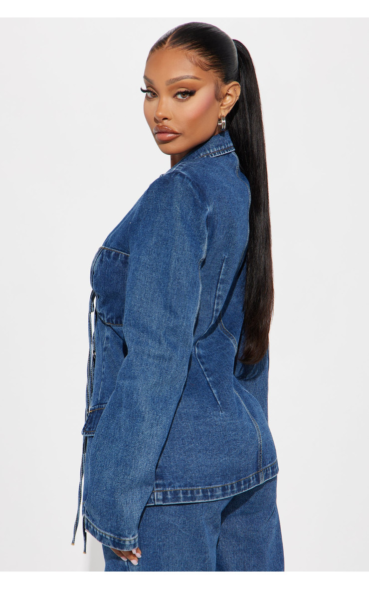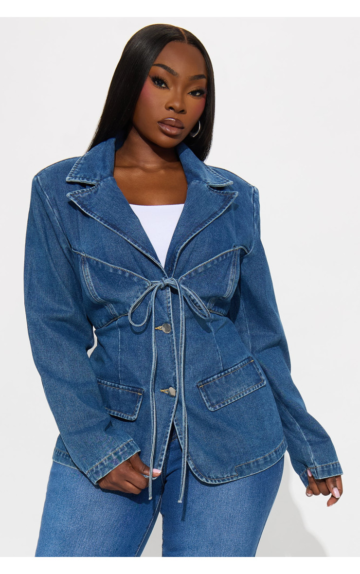 Цей унікальний денім-блейзер із ефектом тай-дай має класичний комір, застібку на ґудзиках та оригінальний дизайн з зав'язками спереду. Ідеально пасує до джинсів "So Inspired" з завищеною талією. Матеріал: 64% бавовна, 36% поліестер. Імпортний товар. Зверніть увагу: через особливий процес обробки кожен виріб є унікальним. Рекомендуємо обирати на розмір менше.